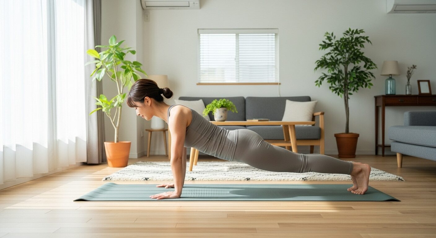 - 🪞 プランク:肘を床につけて体を一直線にキープ。30秒×3セット